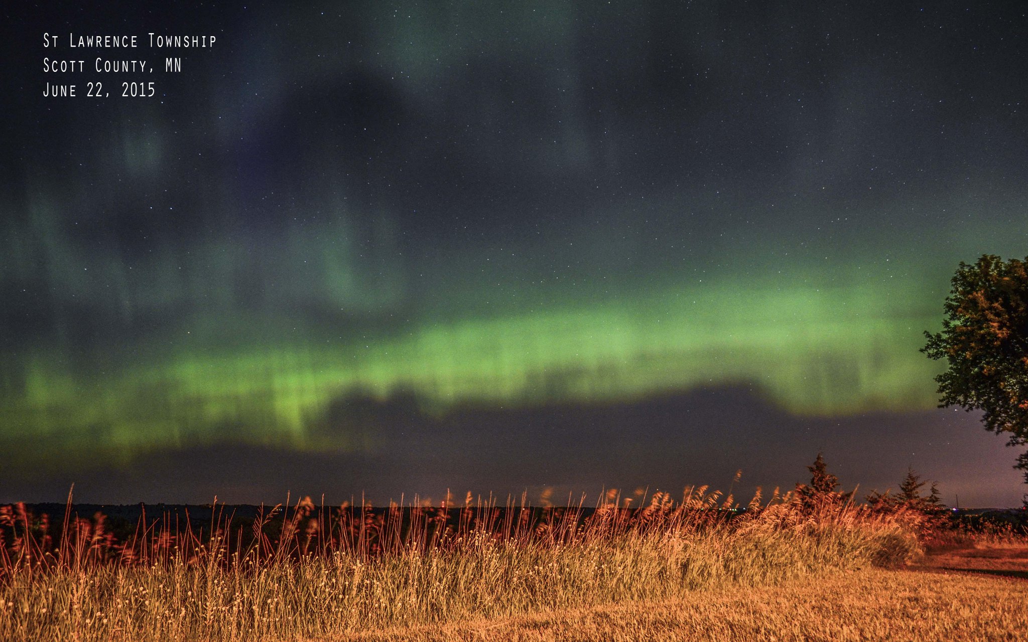 While it's not entirely impossible for the Northern Lights to be seen during the summer months in Minnesota, it's is rare for the Aurora Borealis to be seen this far south in late June. This photo - taken southwest of Minneapolis in rural Scott County - depicts a vibrant show overnight in a serene countryside setting.